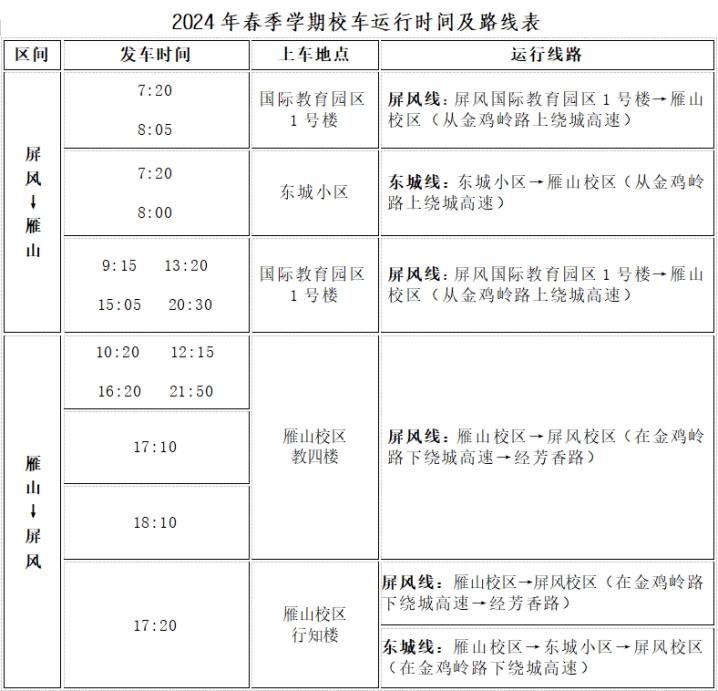 一、2024年3月1日(星期五),校车只发行政班车。发车时间:8:00(东城小区)、8:05(国际教育园区1号楼);雁山返回发车时间:17:10(教四楼)、17:20(行知楼);周末停运(2024年3月2日、3日)。