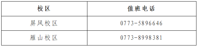 综合服务部暑假期间值班时间为工作日上午9:00-11:30,下午15:00-17:00,值班电话:0773-5898173。
