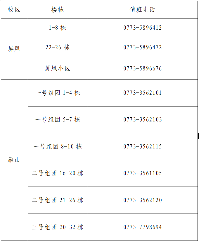 两校区暑假期间各值班点24小时值班,值班点联系方式: