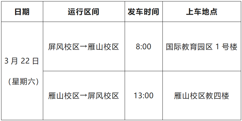 2025年3月22日(星期六)学校举办2025届广西高校毕业生春季就业双选会,根据学校工作协调会议的相关要求,为做好双选会期间教职工往返屏风、雁山两校区的通勤保障工作,现将双选会期间通勤车运行时间通知如下:
