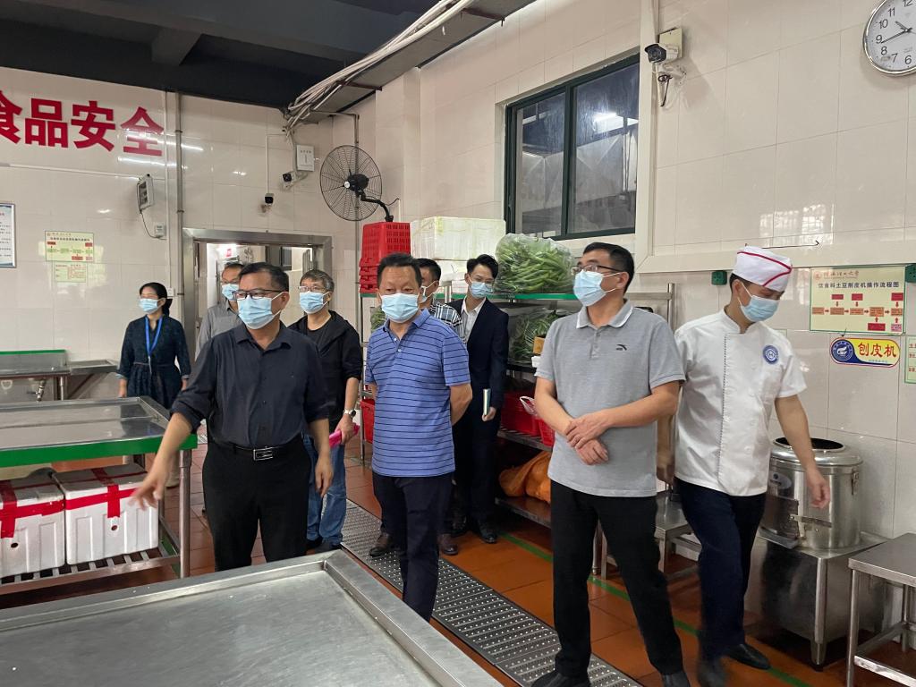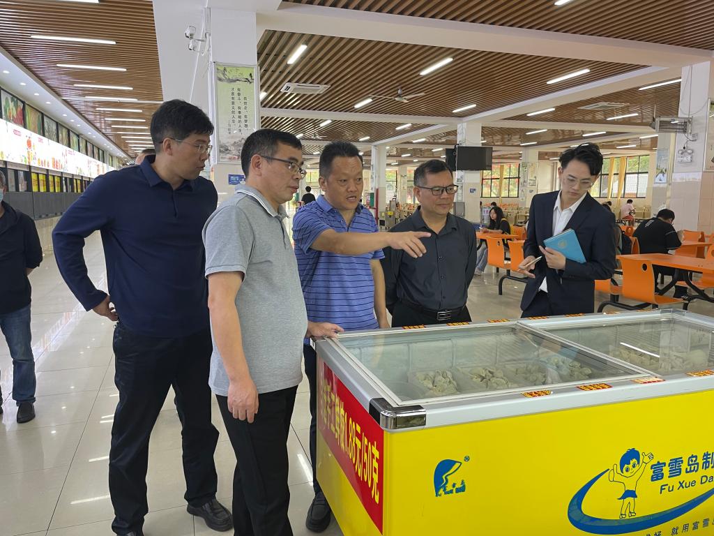 曾繁荣一行先后前往学校雁山校区1#、2#、3#食堂及校内食品经营场所,详细对食品原材料采购与贮存、加工制作、食品留样、环境卫生、餐具清洁消毒及人员健康管理等情况进行全面走访检查,详细了解日常食品卫生安全监管举措,听取了后勤负责人对食堂运营相关情况及近期工作开展情况的汇报。