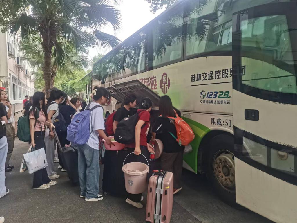 在公寓楼栋前,有专人在现场引导服务;乘车点上,工作人员主动帮助同学搬运行李。做到了行李迅速装车,人员准时发车,一趟接一趟安全地把大家送达屏风校区。