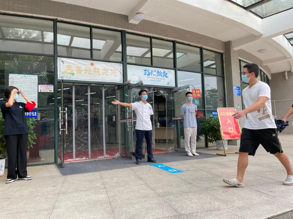 食堂门口引导新生有序就餐