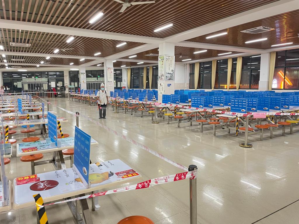 为了给学生提供一个安全有序的就餐环境,饮食中心的工作人员提前拉好分界线做好食堂区域划分,新生以盒饭外带方式单独购餐,避免了人员聚集性就餐。在新生入学之际,食堂更加注重环境卫生管理,安排专人引导新生规范佩戴好口罩,一米间距有序排队取餐,保障了同学们“舌尖上的安全”。
