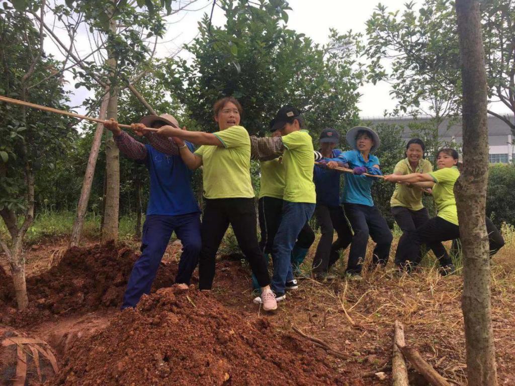 图5 物业中心工作人员给树木填土固定撑杆