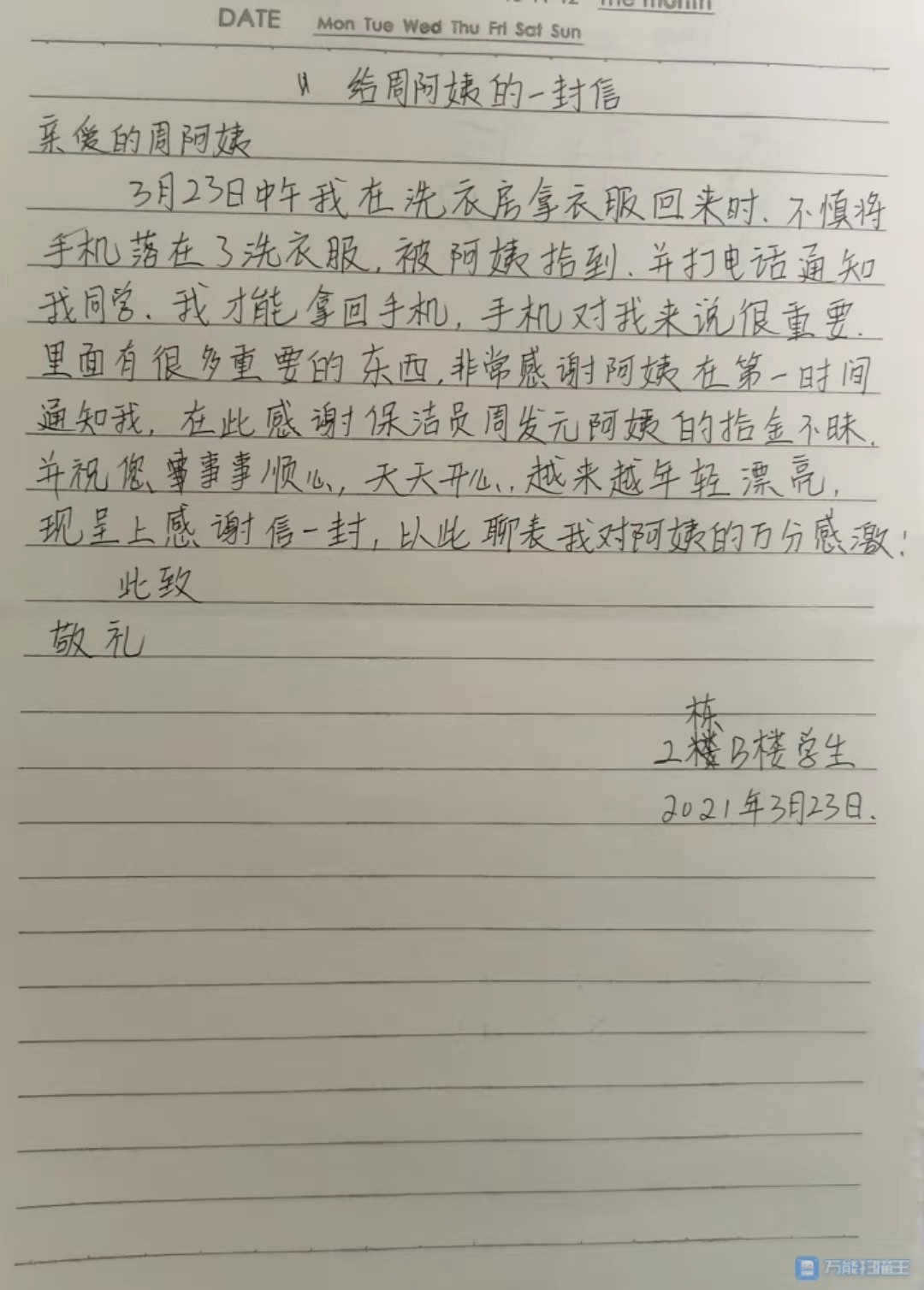 据了解,该学生由于急着拿衣服,走的匆忙,没注意到手机也放在了洗衣房内。该学生拿到失而复得的手机时非常感动,万分感谢细心的保洁员周阿姨将手机捡回,并及时归还。