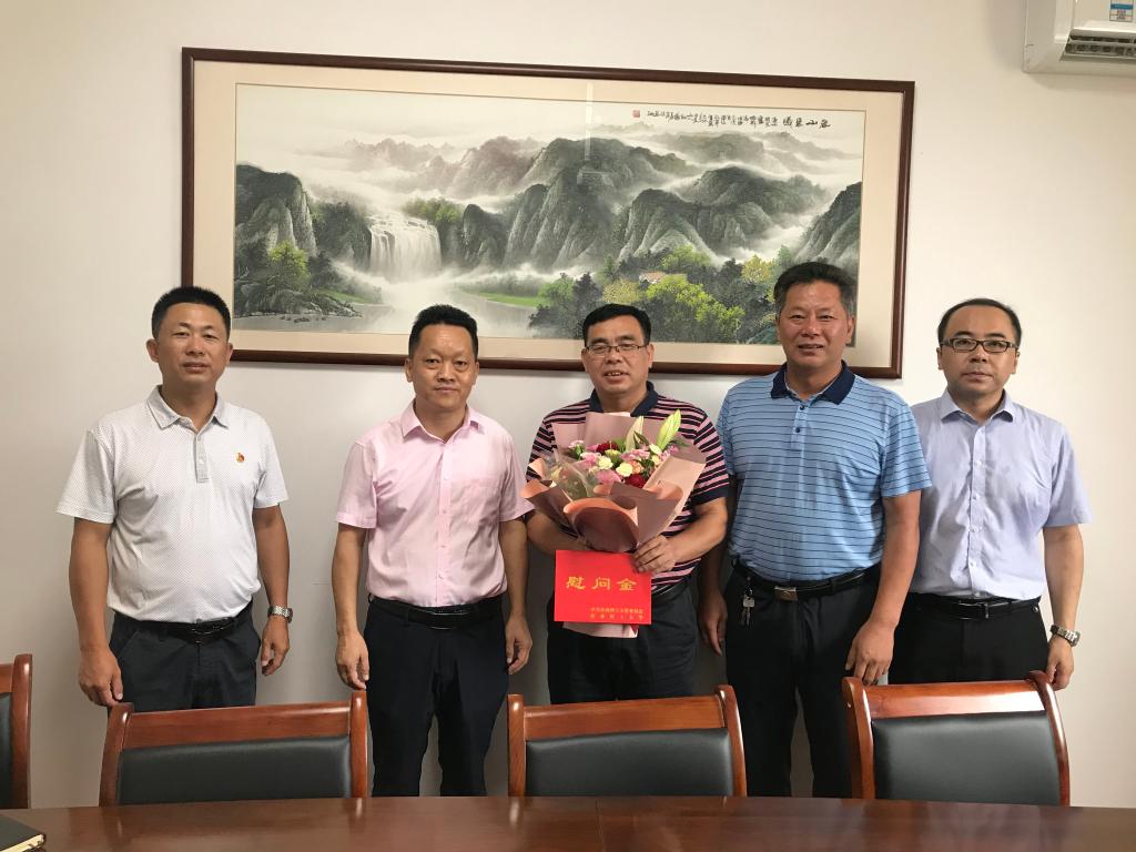 在第36个教师节来临之际,9月7日上午学校党委常委、总会计师曾繁荣在财务处处长周克海、科技处副处长李雷的陪同下,看望慰问了后勤服务集团职工代表饮食服务中心经理奉剑同志,为他送去鲜花和慰问金以及学校的关怀和温暖,后勤服务集团总经理刘战胜出席了此次活动。