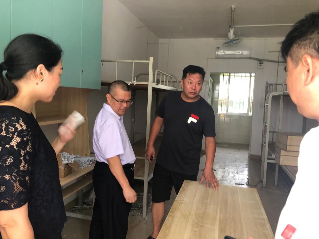 8月13日上午,后勤服务集团支部书记秦勤忠、总经理刘战胜、副总经理唐静妮、侯辉带领后勤公寓、维修、采购中心部门负责人对屏风校区学生宿舍维修改造工作进行巡查。
