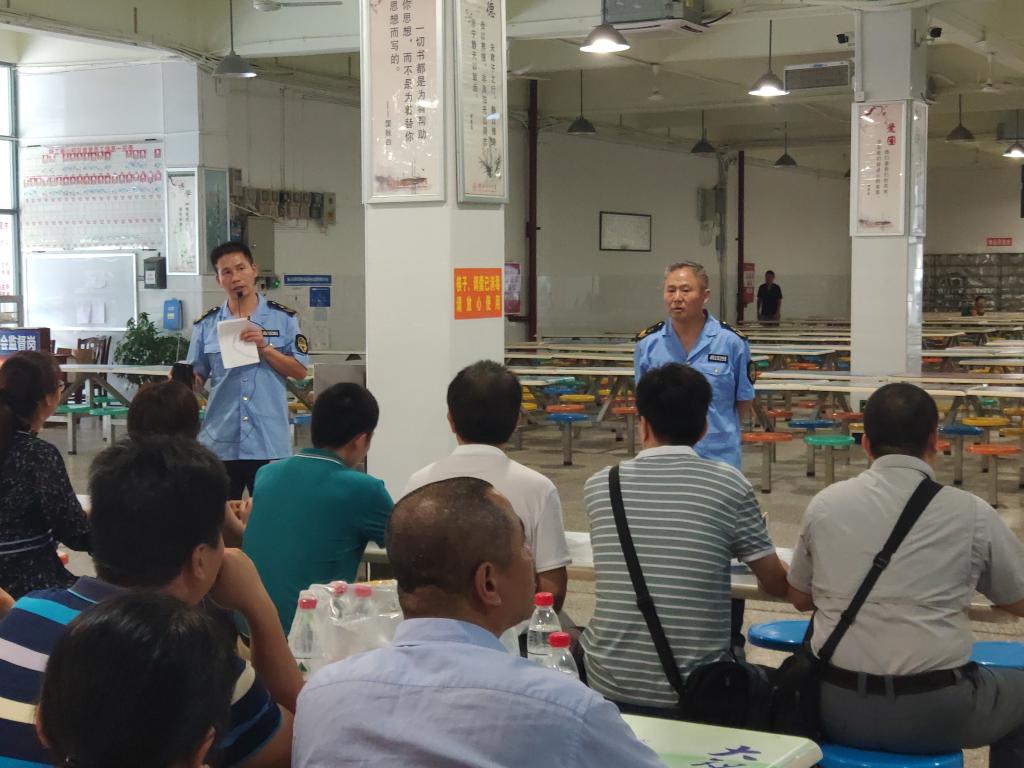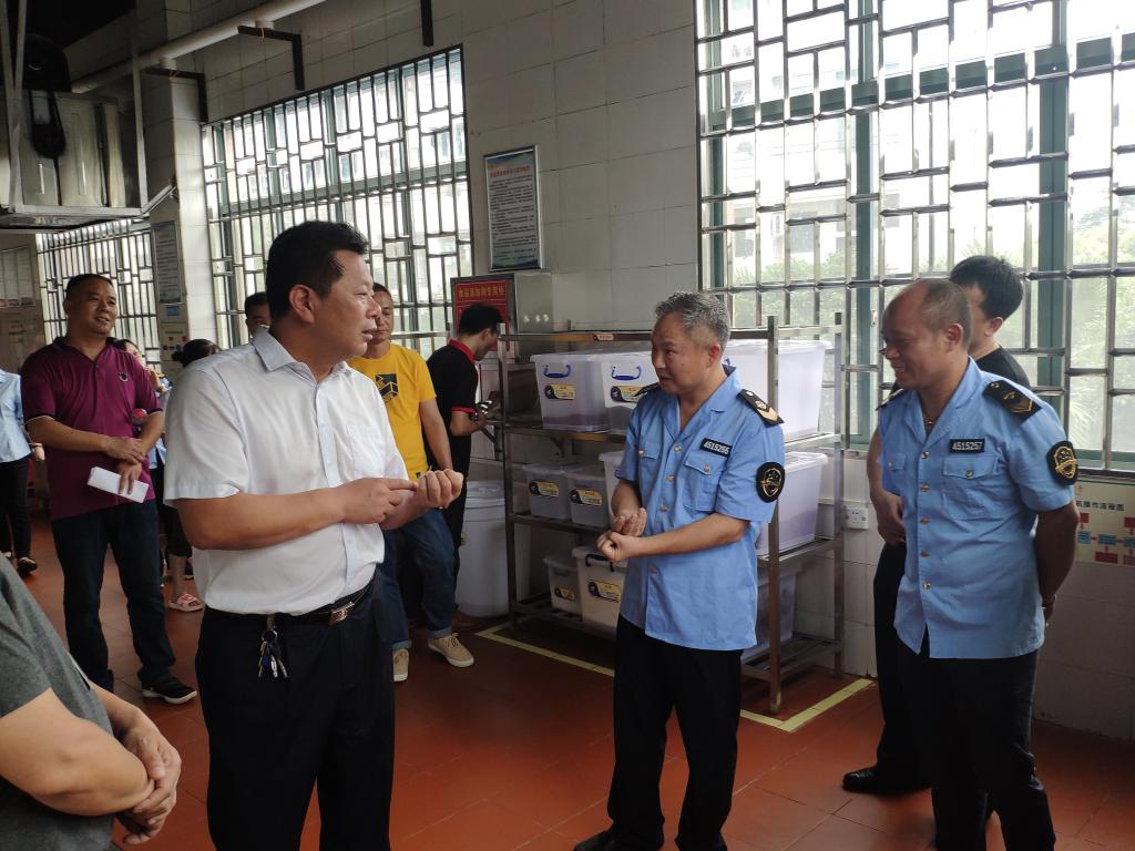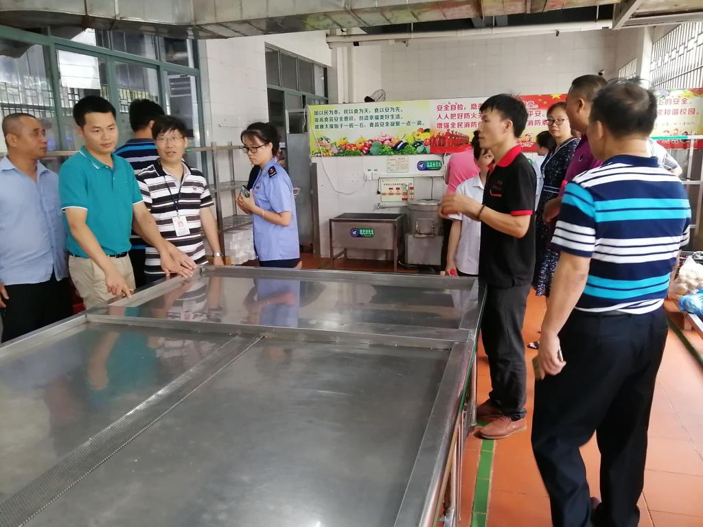 雁山区市场监督管理局局长游晓军在参观前作了动员讲话,游局长在发言中强调了食品安全的重要性,要求各单位正确树立政治意识、安全意识和全局观,对各学校、单位食堂的食品安全作了具体的要求,着重细节管理,一定严格食品操作规程,把食品安全摆在首位,要强化监管、规范操作,努力为人民群众提供安全放心的食品,保障师生“舌尖上的安全”。最后,游晓军局长对我校食堂 “色标管理”、“六T管理”、“无水化厨房”管理推行工作所取得的成效给予了充分肯定,要求各学校利用暑假时间认真对食堂后厨进行合理规划,有针对性的结合实际把食堂后厨整体改造好。