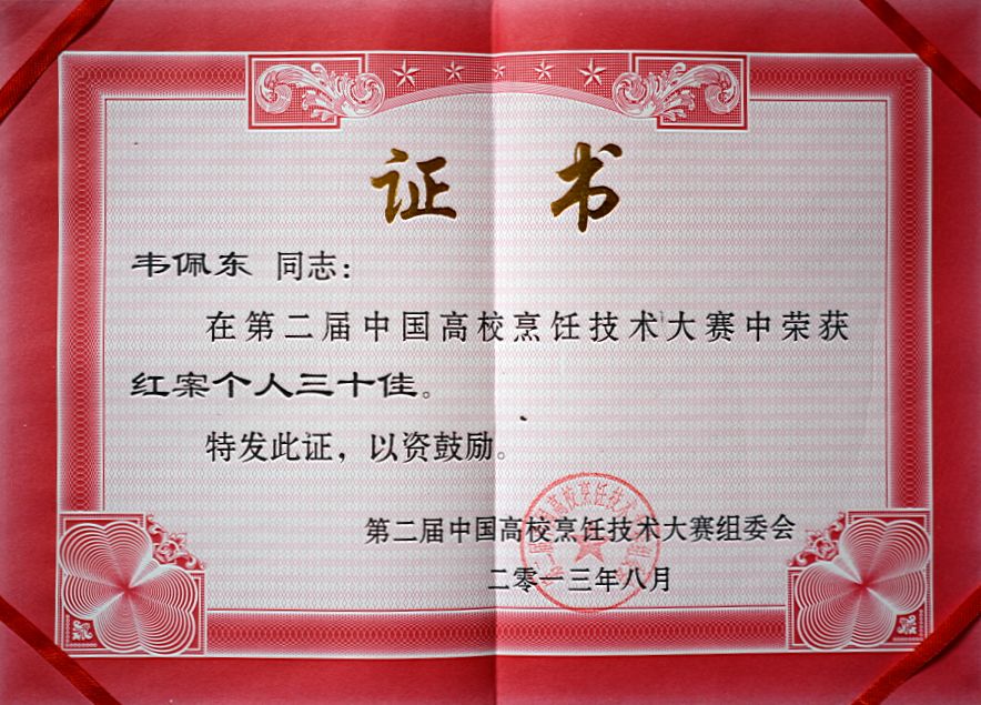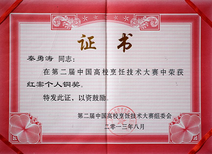 第二届中国高校烹饪技术大赛于今年7月在沈阳东北大学隆重举行。经过各省层层选拔,来自全国30个省、市、自治区137所高校的481名选手代表参加了本次大赛。广西区高校经过预赛选拔了7所高校共21名选手组成了广西区代表队,我校选派的厨师韦佩东、叶国忠、秦勇涛三位同志均参加红案比赛。为赛出我校厨师的烹饪水平,后勤集团在赛前精心组织,对厨师进行预赛选拔,挑选精兵强将参赛,后勤集团领导多次检查厨师准备情况并进行赛前指导,严格按照评分标准进行赛前练兵,最终我校代表队不负众望取得了本次比赛良好成绩,其中韦佩东同志除获得个人金奖外,还取得了红案个人三十佳的优异成绩(广西代表队中唯一的获奖者)。