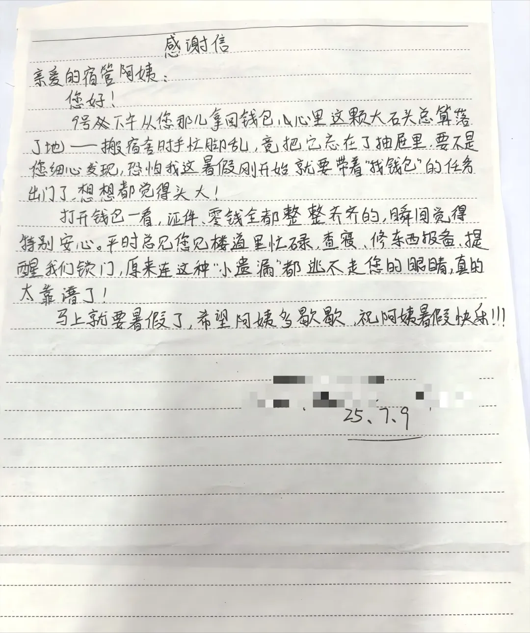 7月9日,钟同学在信中讲述,搬宿舍时手忙脚乱,不慎将钱包遗落在抽屉里。本以为暑假要陷入 “找钱包” 的麻烦,没想到宿管阿姨细心发现后妥善保管。取回时,钱包里的证件、零钱都完好无损,无一遗漏,瞬间让他悬着的心落了地。