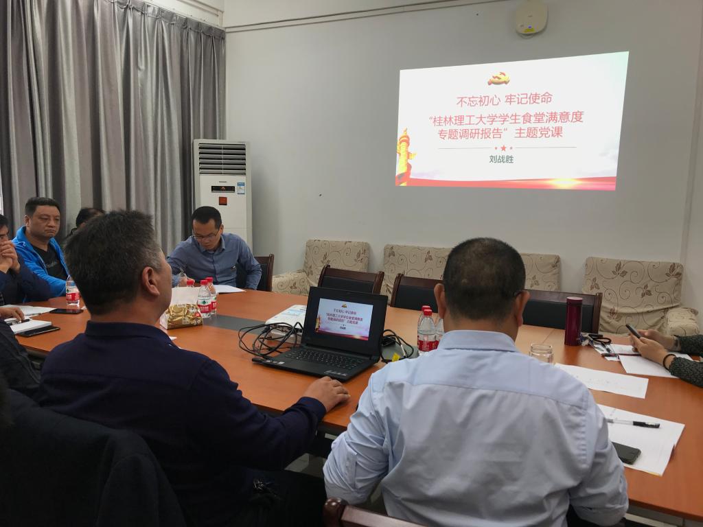 会上,书记秦勤忠、总经理刘战胜、副总经理唐静妮、侯辉,以党课的形式交流了调研成果,党课内容包括四个主题:一是加强校园节能减排工作;二是提升学生食堂满意度;三是提升学生公寓管理水平;四是做好后勤内部控制,保障学校稳健发展。领导班子成员对照初心使命,结合自身工作和调研课题,查找存在问题、剖析产生原因、提出解决对策。